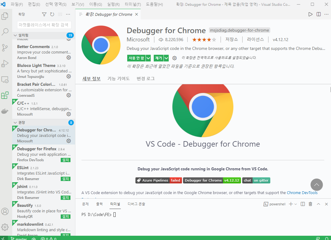 VScode의 가장 큰 장점은 다양한 확장 프로그램이었습니다. 확장 프로그램들은 VScode 내부의 마켓플레이스에서 쉽게 찾아보고 설치할 수 있으며, Debugger for Chrome과 같은 확장 프로그램을 설치하면 IDE의 디버깅과 같은 기능도 사용할 수 있습니다.