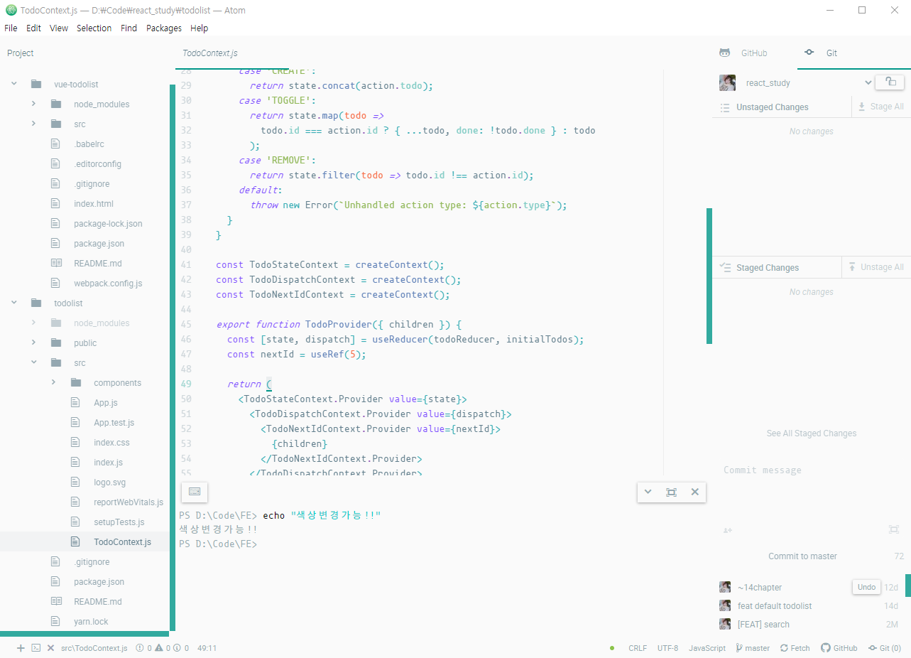 Atom의 가장 큰 장점은 Git과의 연동이었습니다. 마찬가지로 기본적인 구문 강조, 자동완성, Drag & Drop이 가능한 화면 분할을 제공하고, 테마 설정도 가능합니다. 또한, package 설치를 통해 Terminal을 이용할 수 있으며, VScode와 유사하게 Atom 내에서 Package를 검색하고 설치할 수 있어 편리했습니다.