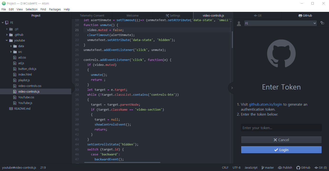 패키지를 설치하는 과정에서도 로딩이 오래 걸리거나 하는 부수적인 문제가 있었고, Atom을 실행할 때마다 프로젝트 폴더를 다시 오픈해야 하는 번거로움이 있었습니다. Git과의 연동도, VScode에서 유사한 확장 기능을 많이 제공하기 때문에 특별히 유용하지는 않았습니다.